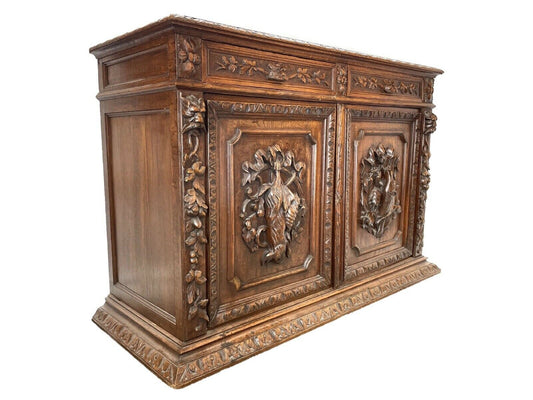 19th Century - Green Man Oak Carved Sideboard with Carvings of Game