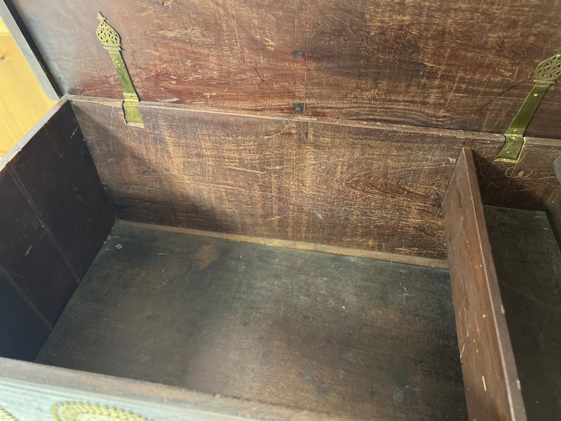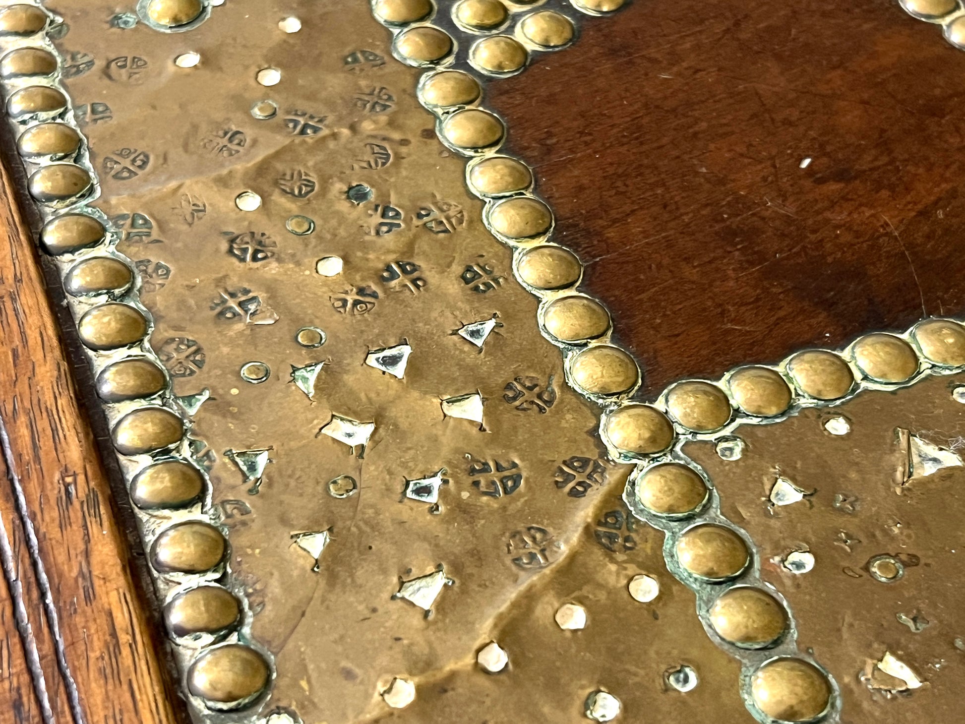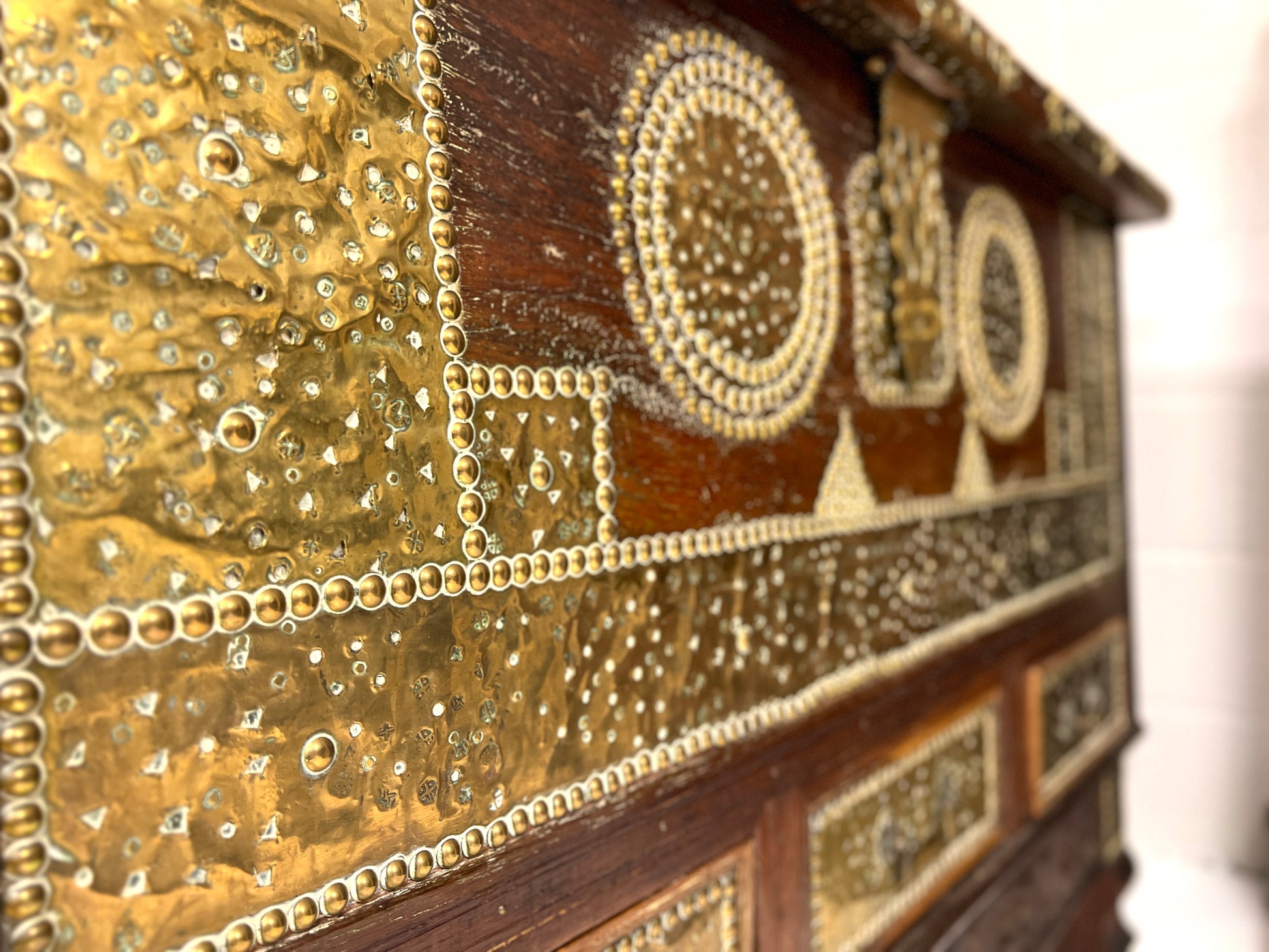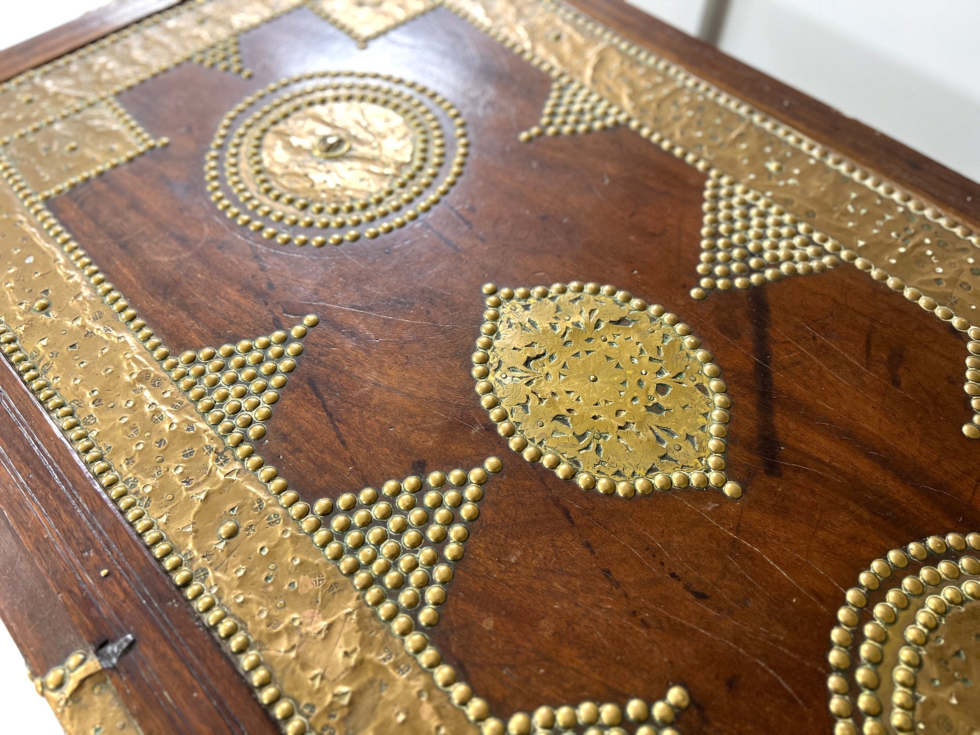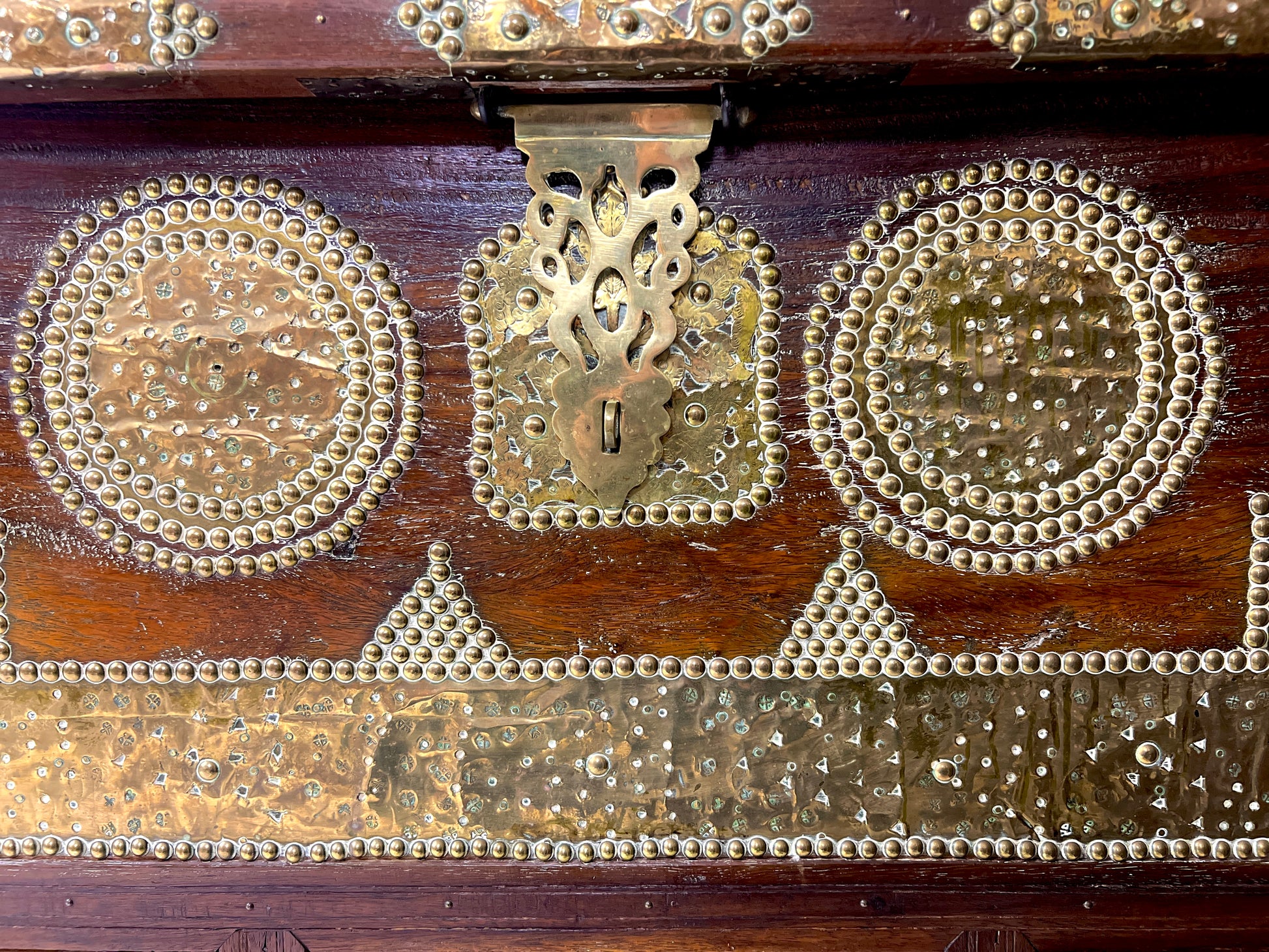A late 19th century Zanzibar chest crafted from teak and richly decorated with hammered brass inlay, rivets, and stamped cross motifs. The chest features a large storage compartment beneath a lift-up top, concealing a smaller internal compartment, with three drawers positioned at the base for additional storage.