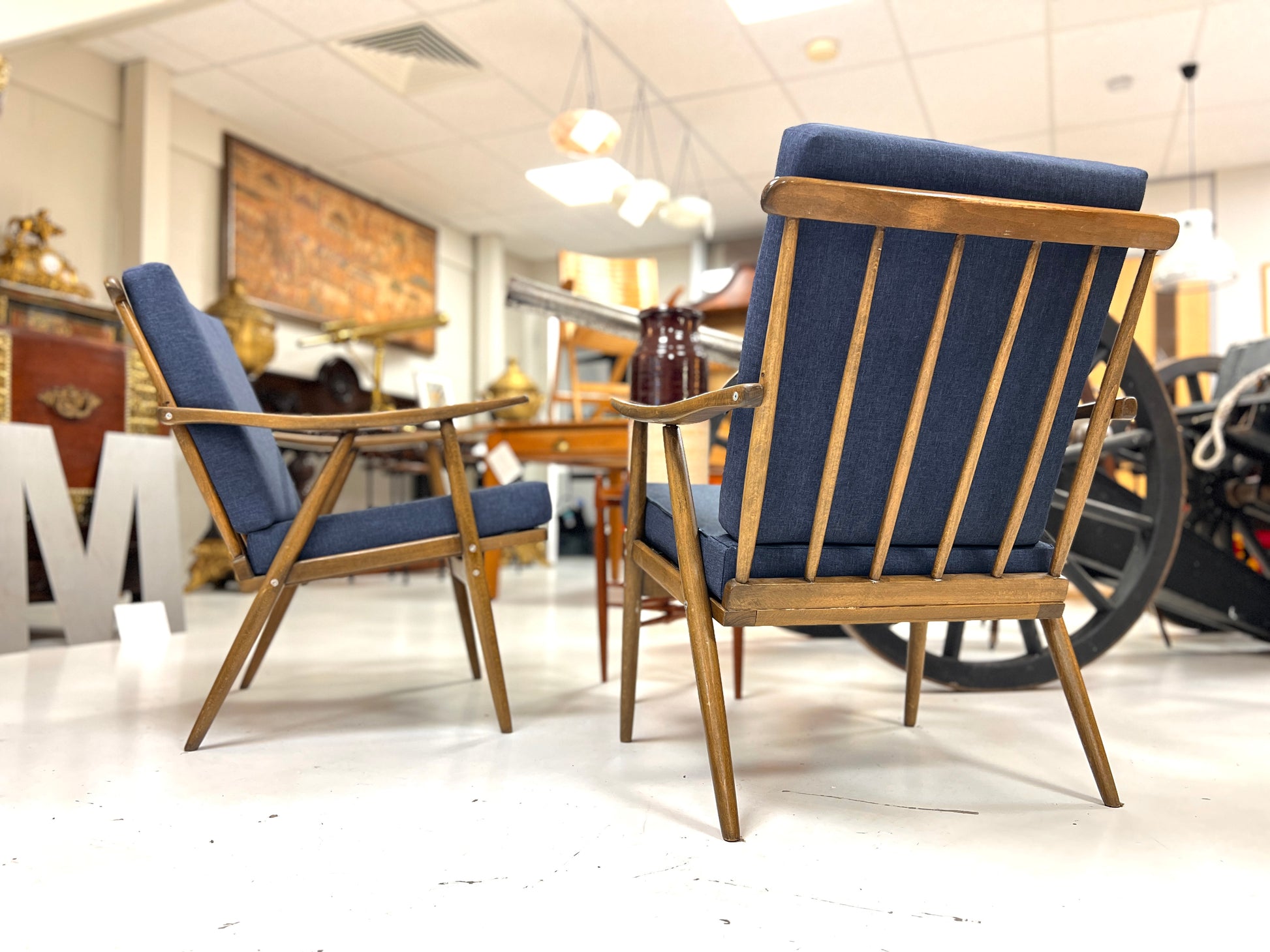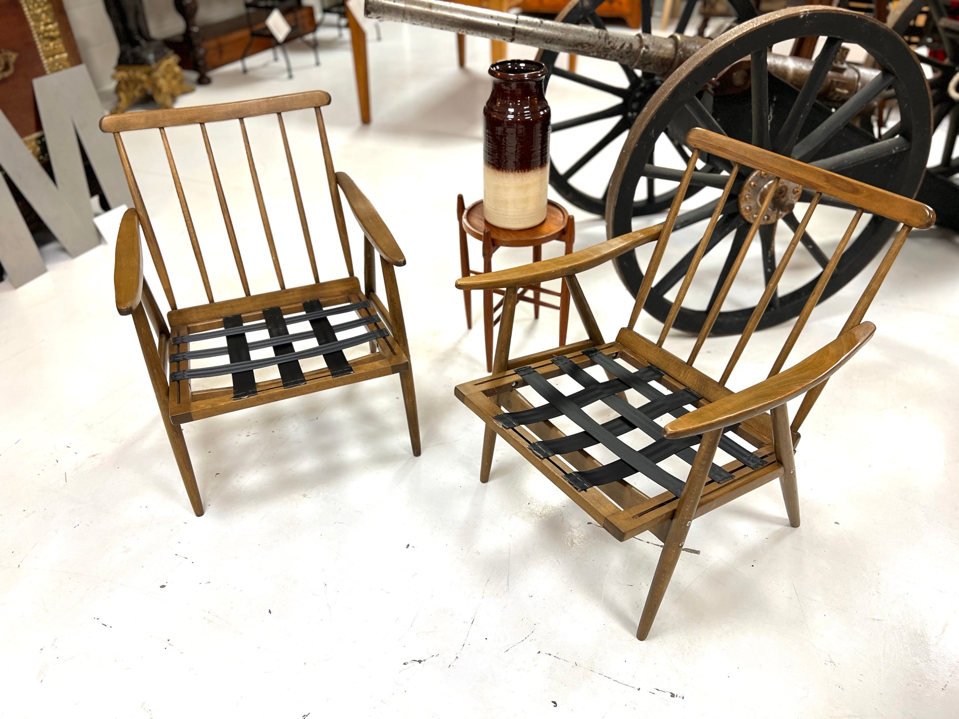 The chairs have undergone historic restoration, including re-webbing and new upholstered cushions with foam inserts. They are in very good condition overall, with only minor wear commensurate with use to areas such as the backs and armrests. The only notable point is that the frames have been re-secured in the past using visible steel screws. Despite this, the chairs remain structurally sound and visually very attractive examples.