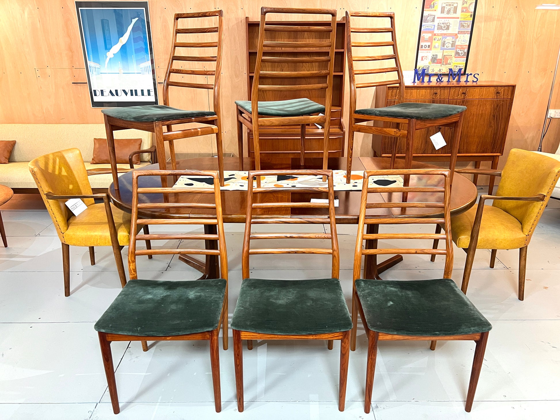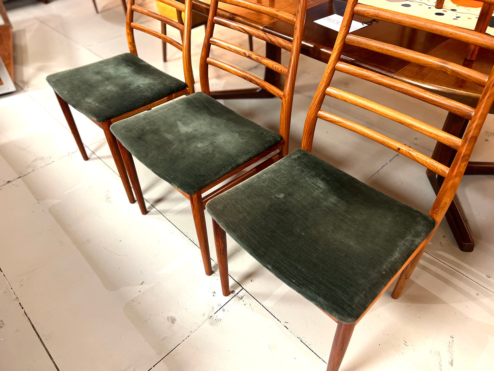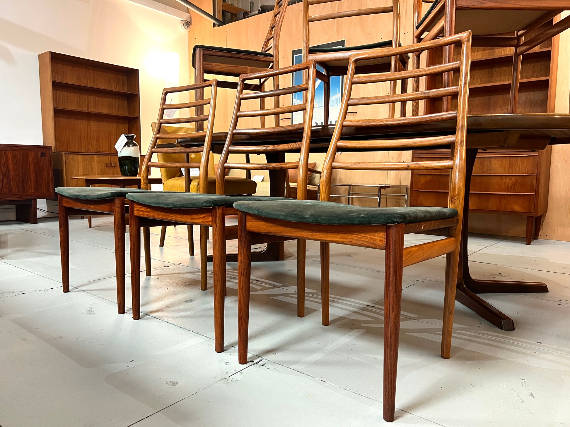 A very rare set of six rosewood dining chairs by Dyrlund. The rosewood frames are in excellent condition, showcasing the rich colour and grain characteristic of Danish mid-century design.