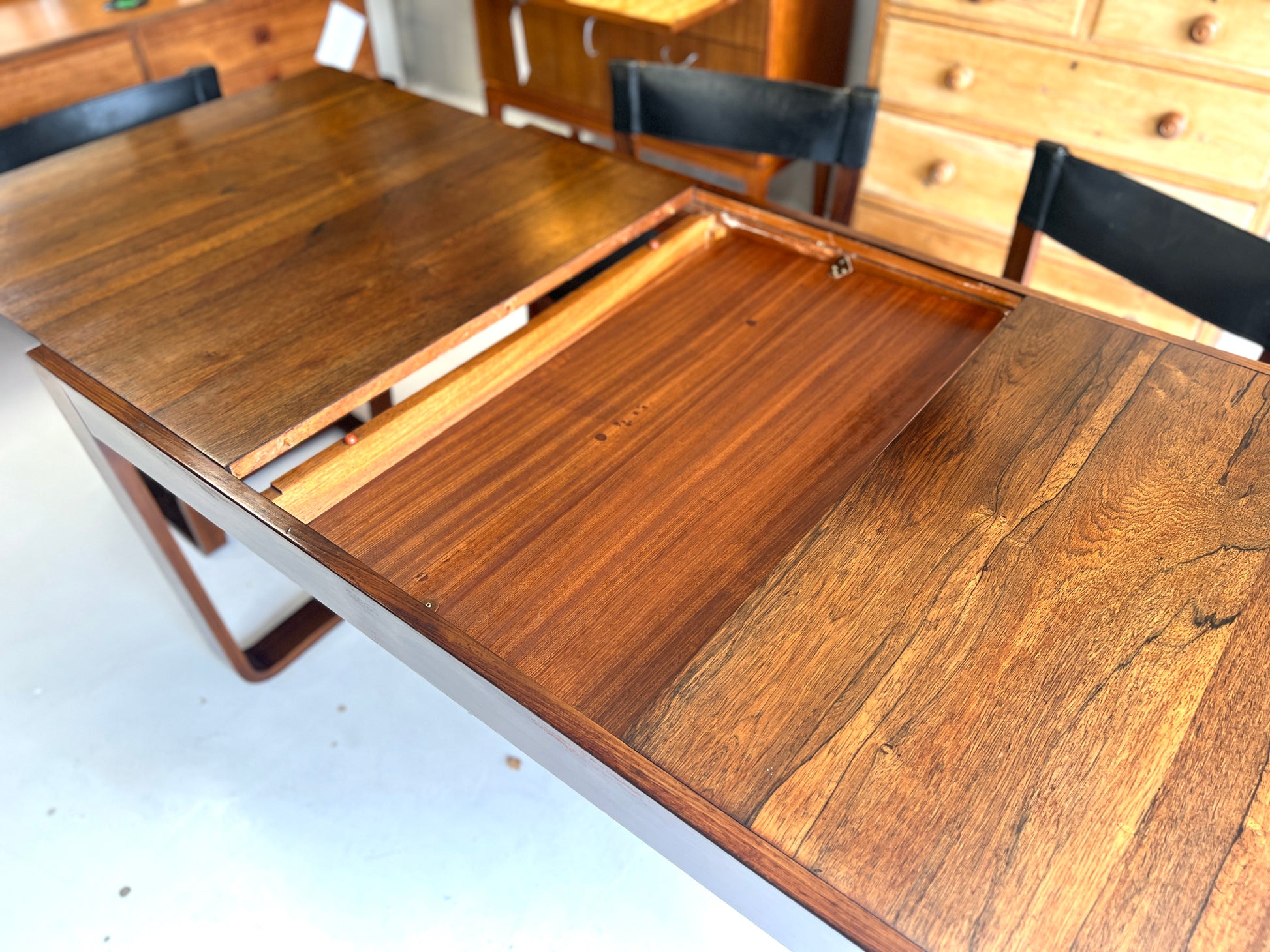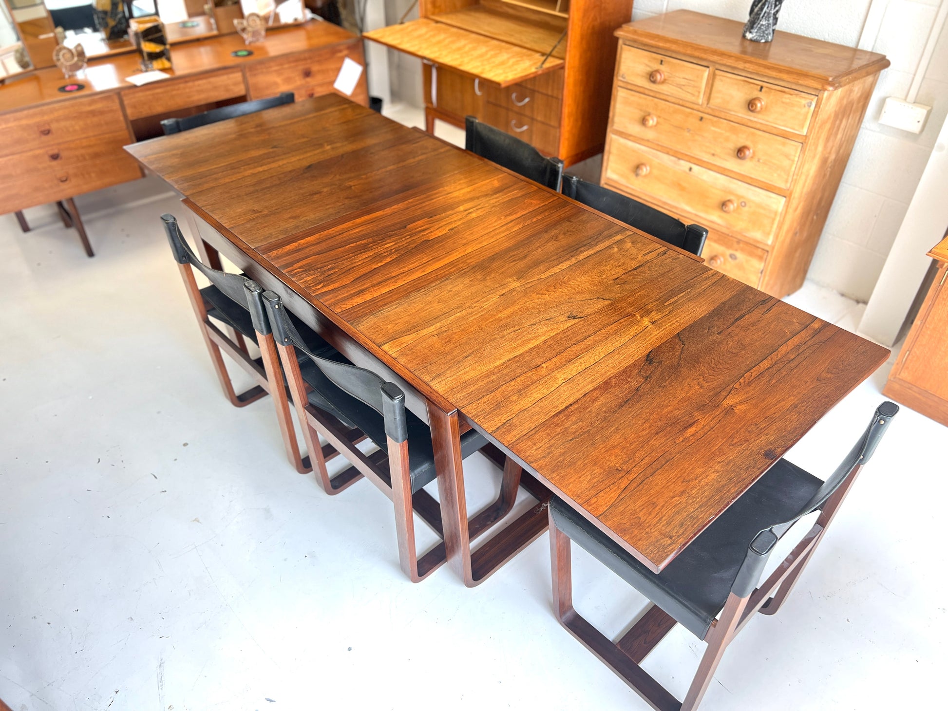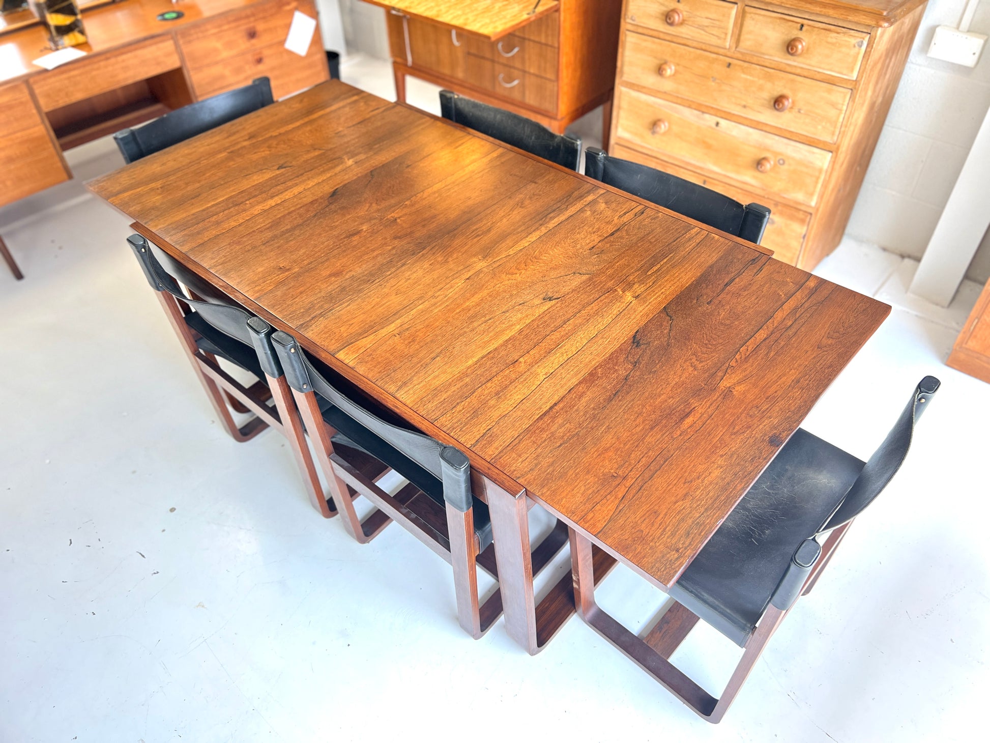 A rosewood extending dining table and a set of 6 matching chairs with leather upholstery, designed by Gunther Hoffstead for Uniflex. The set showcases elegant mid-century design with clean lines and warm rosewood tones, extending to comfortably accommodate larger gatherings.