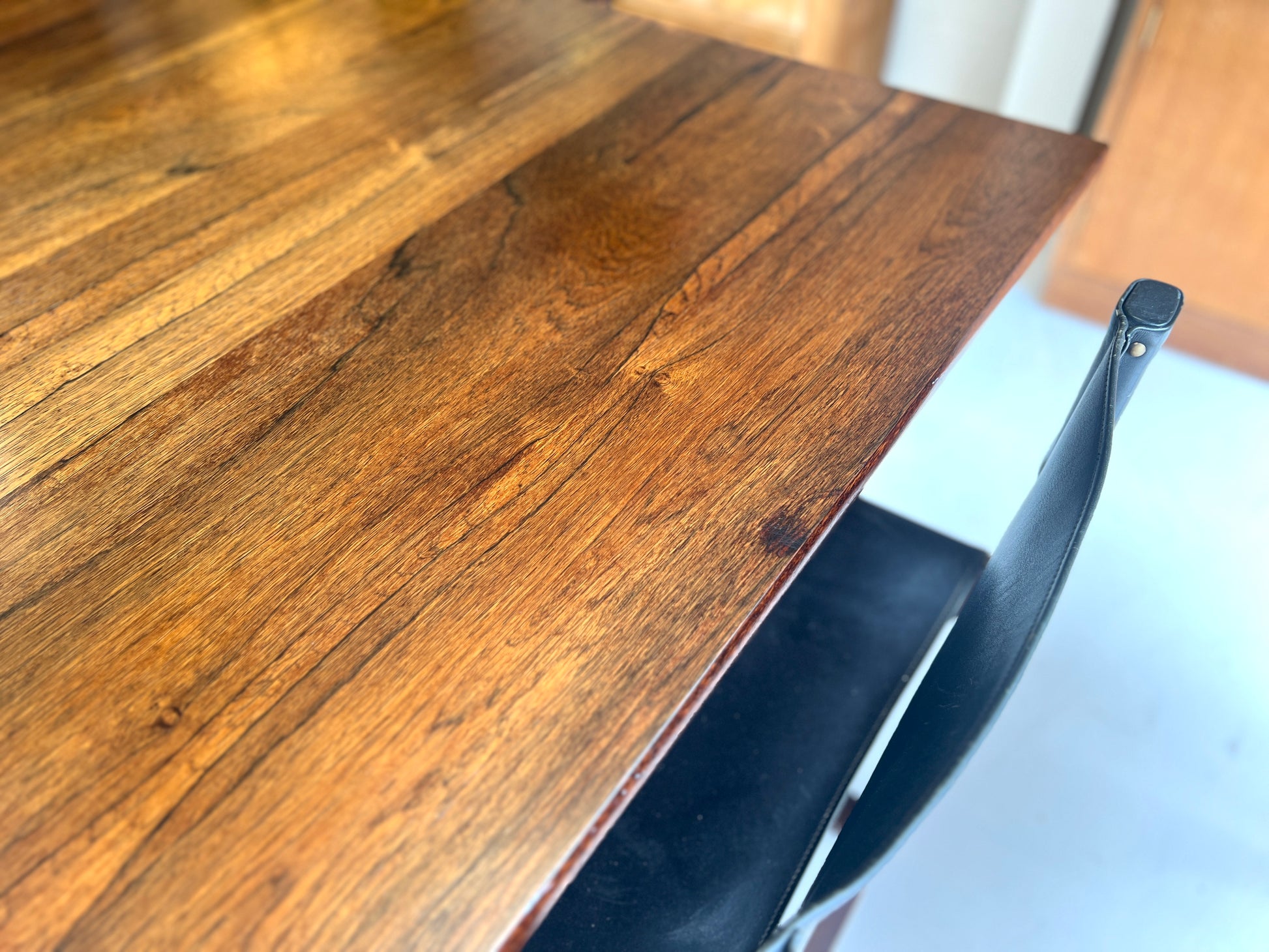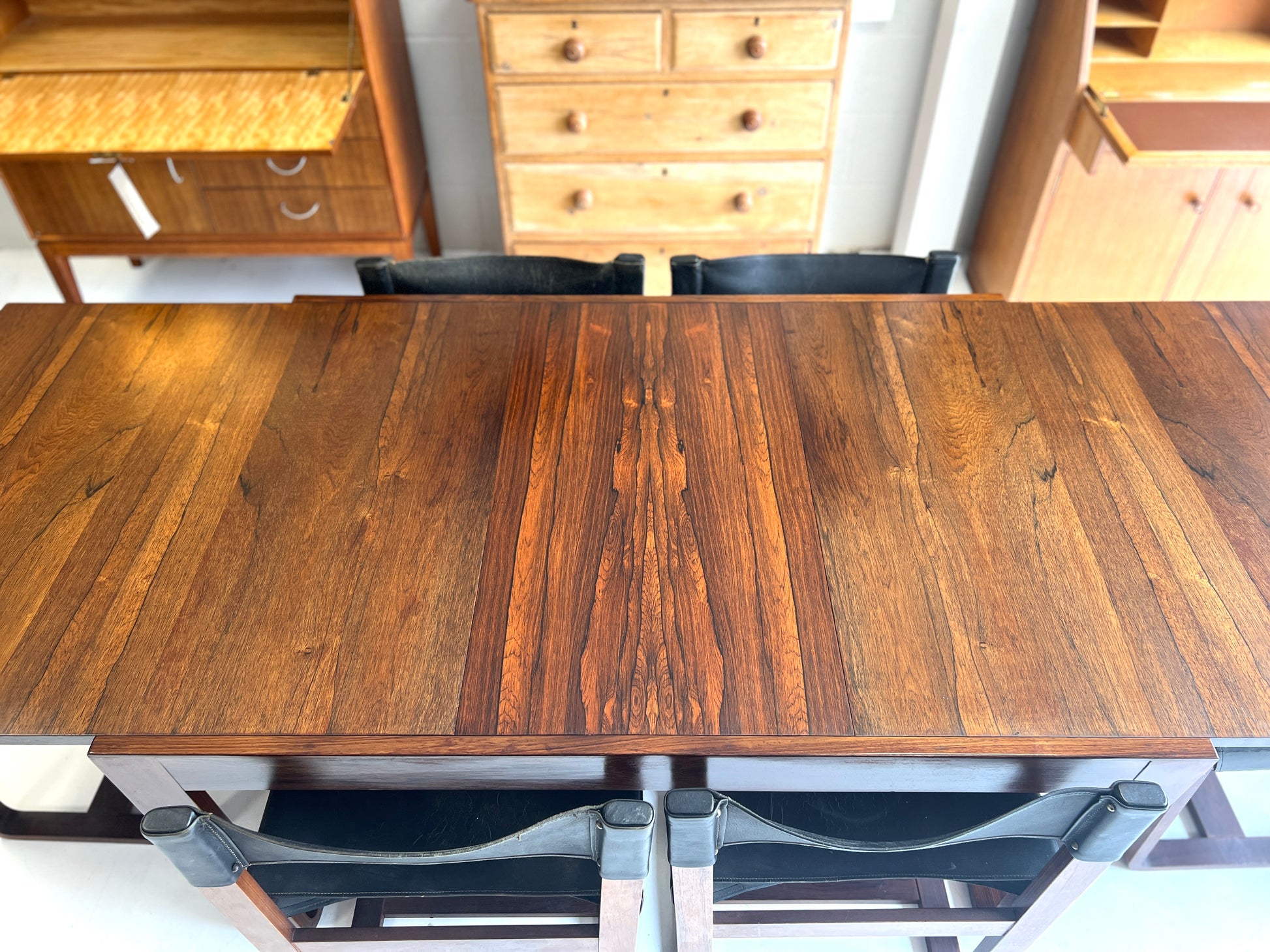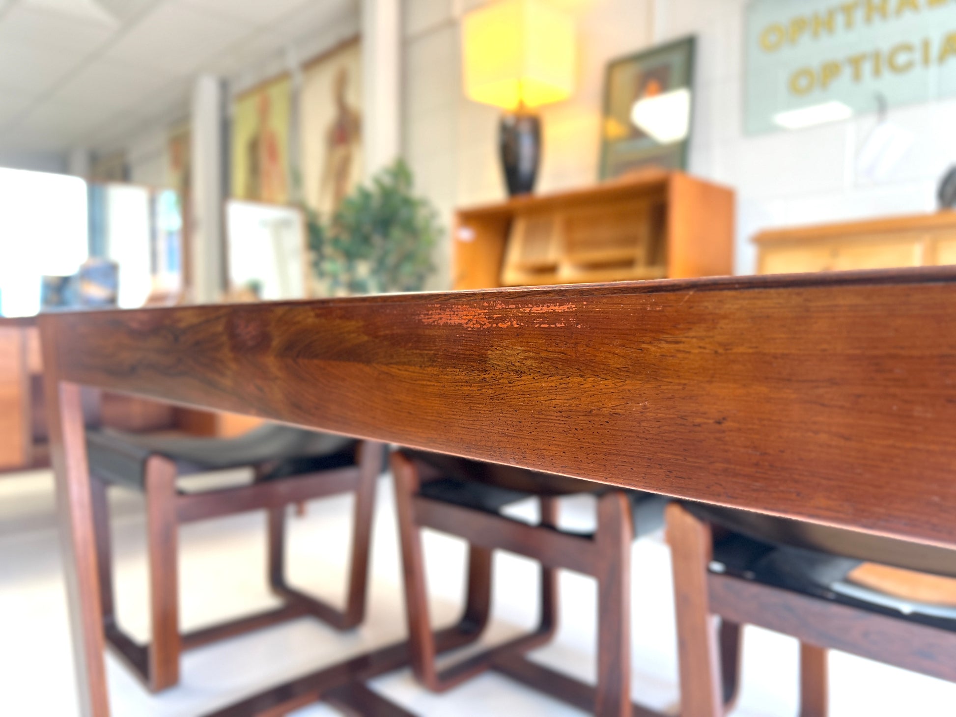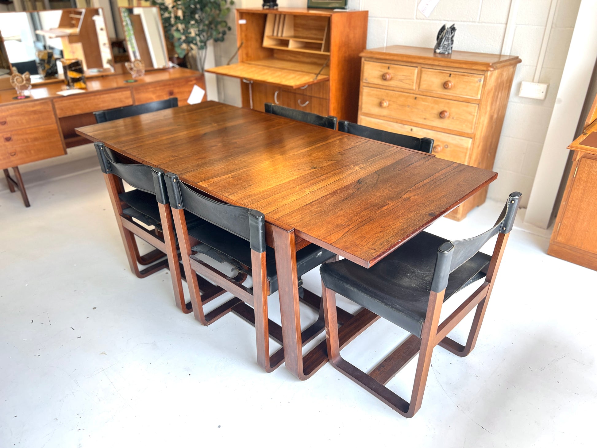 A rosewood extending dining table and a set of 6 matching chairs with leather upholstery, designed by Gunther Hoffstead for Uniflex. The set showcases elegant mid-century design with clean lines and warm rosewood tones, extending to comfortably accommodate larger gatherings.