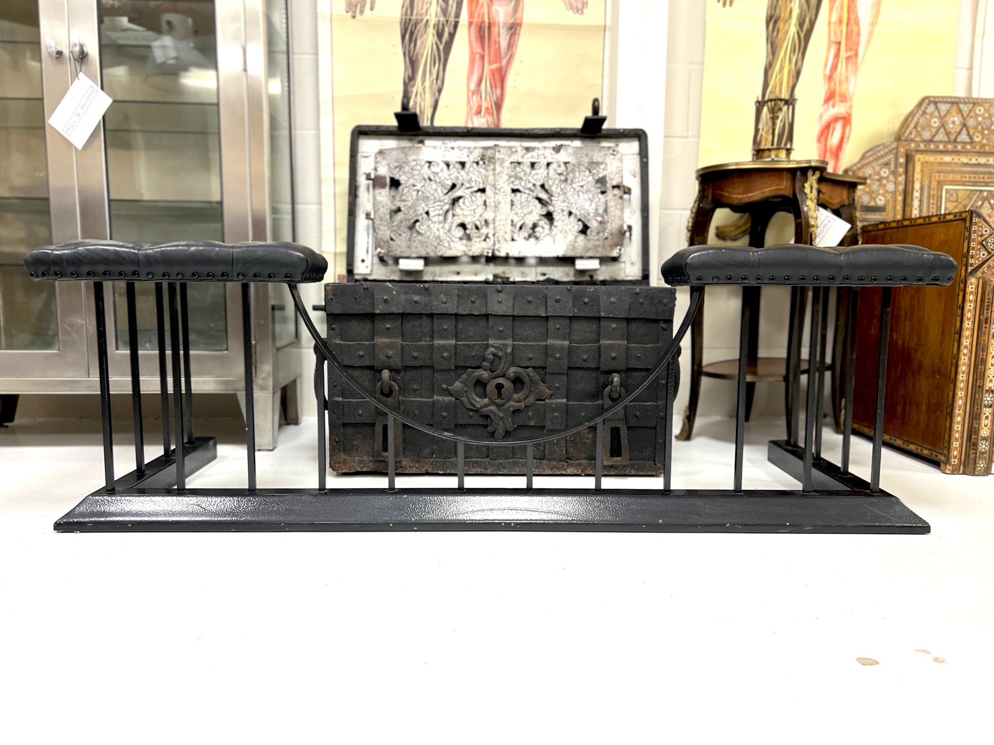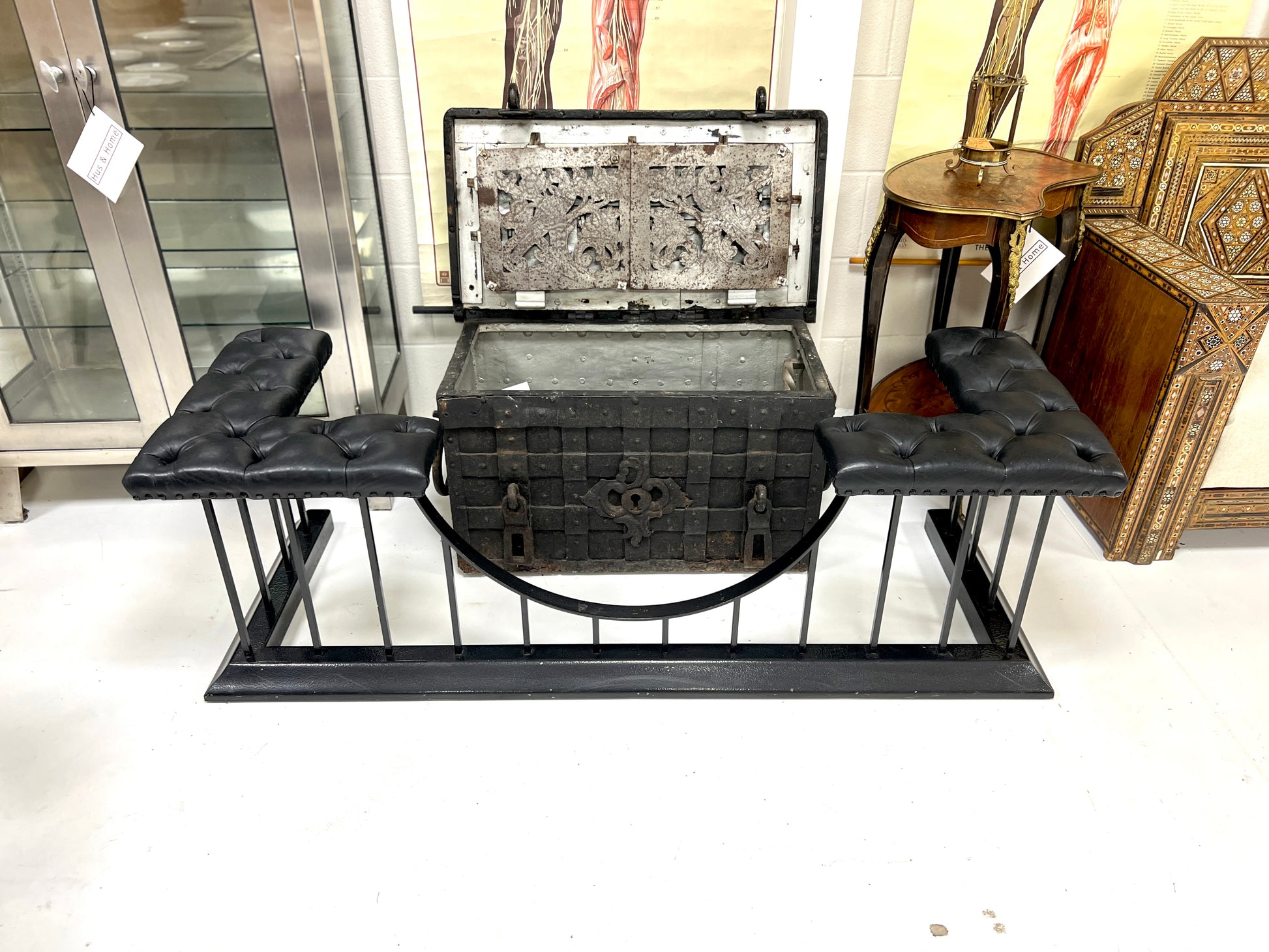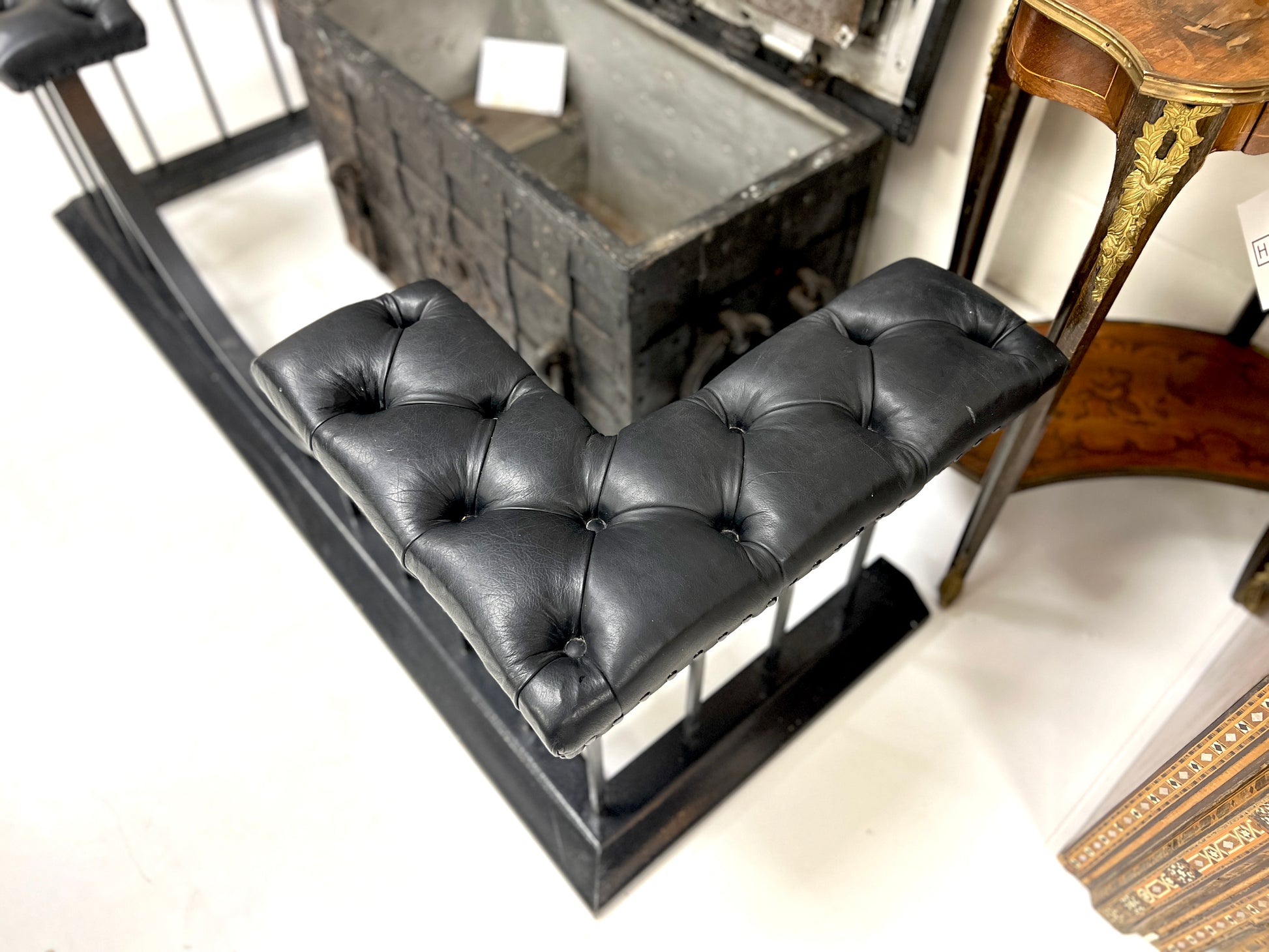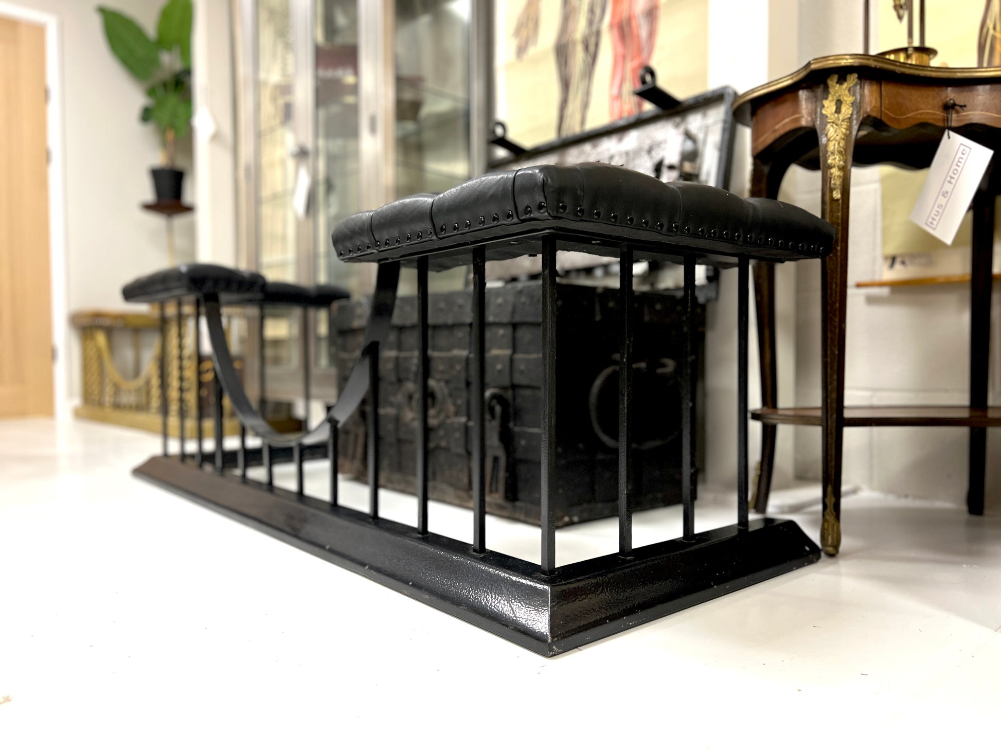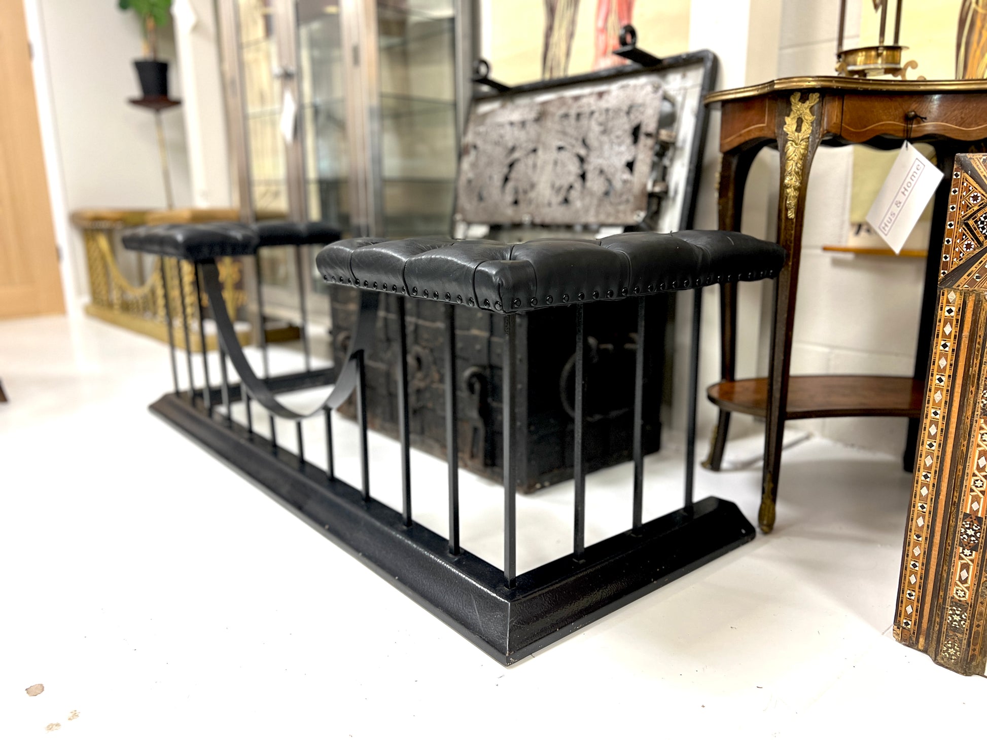 A jet black club fender featuring a studded black leather upholstered seat and a powder-coated steel base. The bold monochrome design gives this classic fireplace form a contemporary edge while retaining the traditional profile and functionality of a club fender.