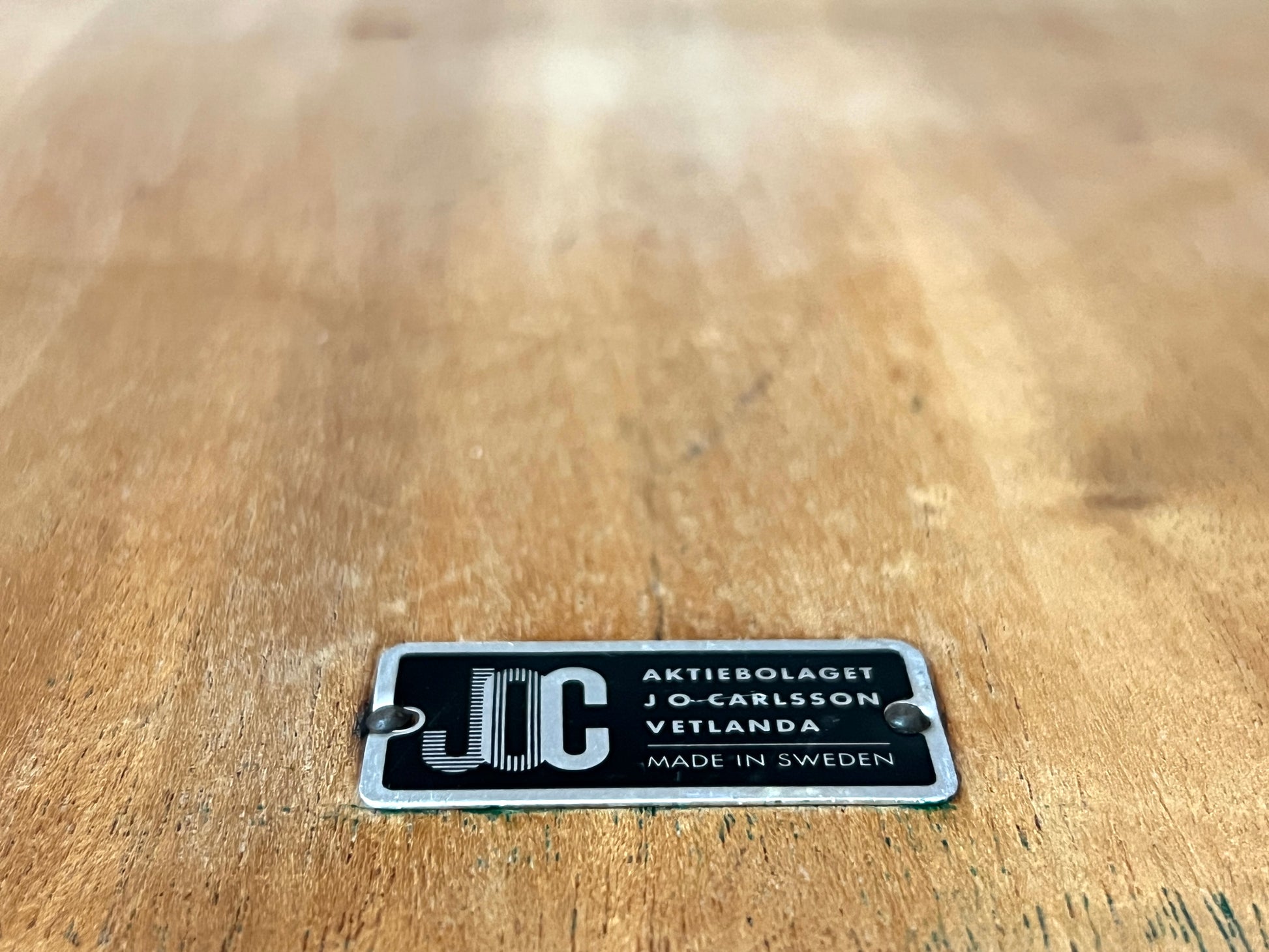 A stylish round Swedish teak coffee table by JOC Aktiebolaget J O Carlsson Vetlanda, with the maker’s label present. The table showcases elegant Scandinavian lines and warm teak grain, characteristic of Swedish mid-century craftsmanship.