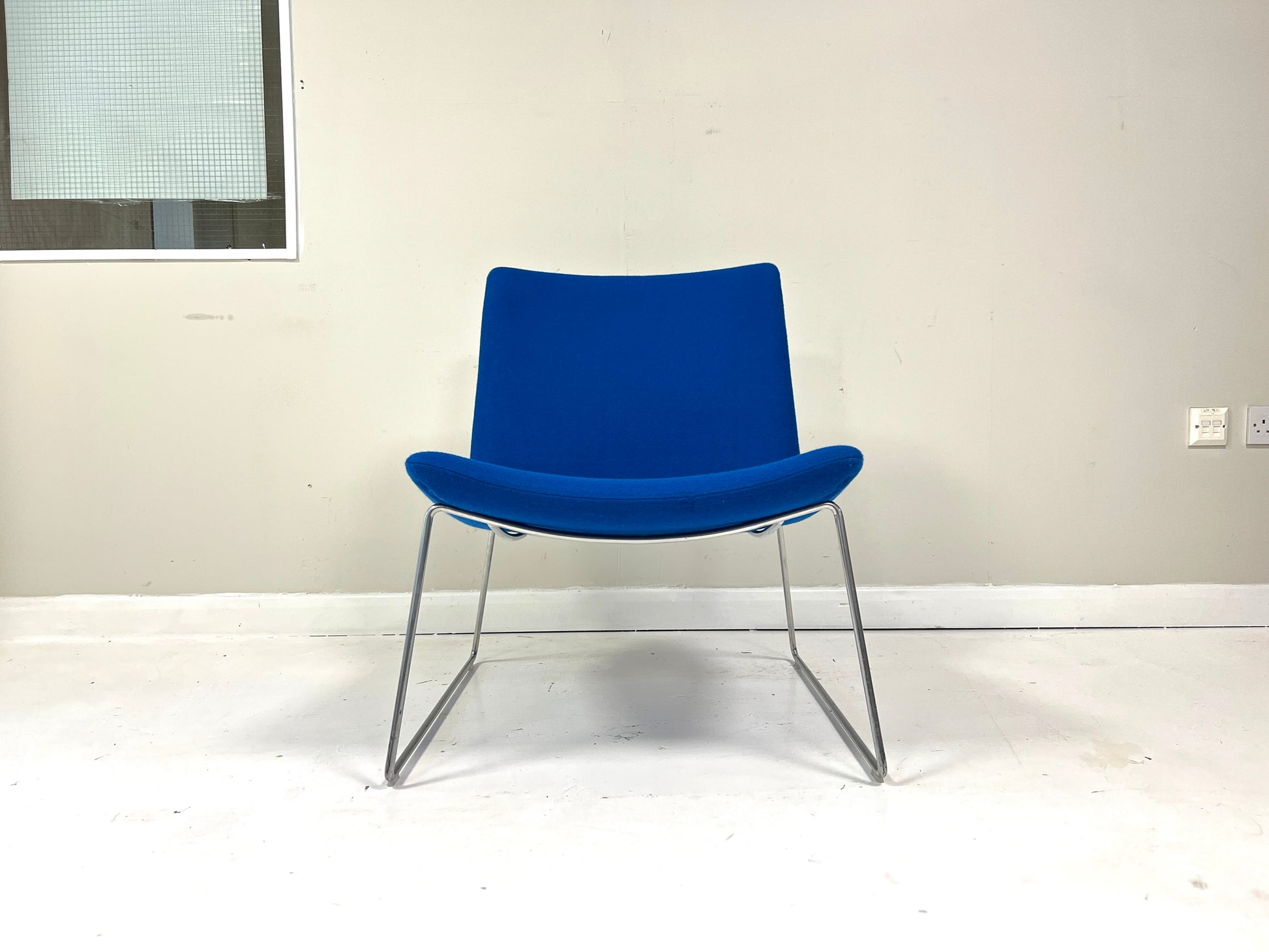 A contemporary low lounge chair or breakout chair with blue upholstery sat on a chrome frame.